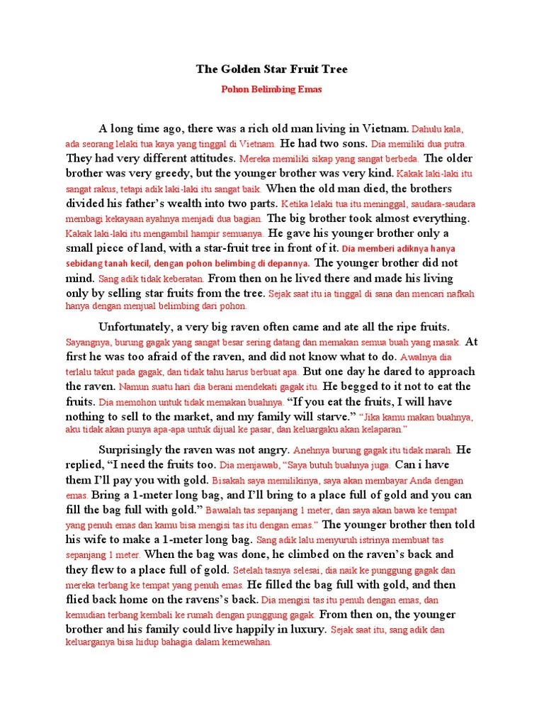 Diharapkan siswa lebih banyak berlatih membaca . They had very di!erent attitudes. A long time ago there was a rich old man living in vietnam. Narrativetext#videobahasainggris#bahasainggristhe golden star fruit tree narrative text| golden star fruit tree english learning . How many children did a man have . Soal dari text the golden star fruit tree brainlycoid. 10 contoh soal essay recount text tentang liburan dan kunci. The big brother took almost everything . A long time ago, there was a rich old man living in vietnam. Demikianlah pembahasan yang dapat kami sampaikan mengenai terjemahan teks the golden star fruit tree. Where did the story happen? They had very different attitudes. Rpp daring 2 lembar dilengkapi dengan video materi pembelajaran masih tentang folktale dan narrative text.